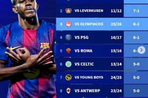 體育資訊10月22日訊 在本輪歐冠,巴薩6-1大勝奧林匹亞科斯。德轉(zhuǎn)也盤點了巴薩隊史在歐冠最大比分獲勝紀錄榜,具體如下: