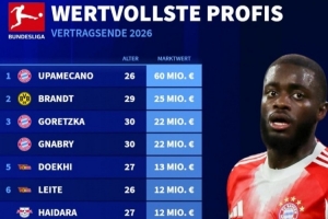 體育資訊10月23日訊 《轉(zhuǎn)會市場》統(tǒng)計(jì)了合同將在明夏到期的德甲球員身價情況,拜仁中衛(wèi)于帕梅卡諾獨(dú)自領(lǐng)跑。