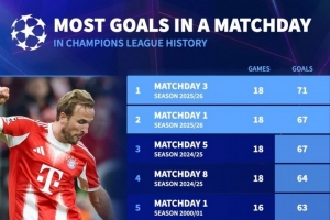 歐冠單輪進(jìn)球數(shù)量榜:本輪18場(chǎng)比賽71球居首,本賽季首輪67球次席