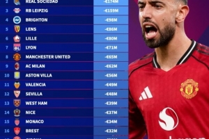 以下為今年五大聯(lián)賽球隊(duì)身價(jià)跌幅榜top20: