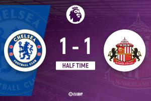 上半場傷停補(bǔ)時3分鐘,半場結(jié)束,切爾西暫1-1桑德蘭。