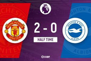 上半場傷停補(bǔ)時(shí)1分鐘,半場結(jié)束,曼聯(lián)暫2-0布萊頓。