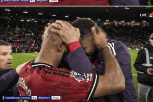 蜂王與狼王!賽后曼聯(lián)兩大新援姆伯莫和庫(kù)尼亞緊緊擁抱慶祝勝利