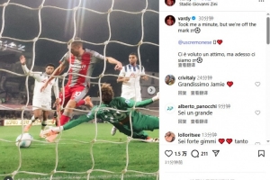 體育資訊10月26日訊 瓦爾迪今天在Instagram發(fā)文,慶祝自己打入克雷莫內(nèi)塞生涯首球。