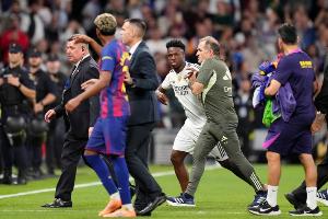 亞馬爾走近場邊時,維尼修斯走過來對他做了“話太多”的手勢,兩人發(fā)生爭吵。皇馬門將教練略比斯試圖將維尼修斯拖回球員通道,但這位巴西人開始沖向亞馬爾,被皇馬四名工作人員攔住。拉菲尼亞跑向國家隊隊友維尼修斯,被皇馬的巴爾韋德及時制止。