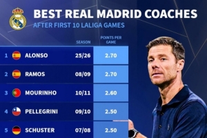 體育資訊10月27日訊 皇馬在本輪西甲焦點(diǎn)戰(zhàn)2-1力克巴薩,阿隆索帶隊(duì)延續(xù)了出色的戰(zhàn)績。德轉(zhuǎn)數(shù)據(jù)統(tǒng)計(jì)顯示,阿隆索執(zhí)教皇馬的前10輪西甲拿分并列歷史第一。