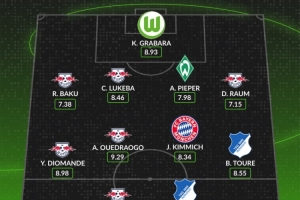 后衛(wèi):巴庫(萊比錫,7.38分)、盧克巴(萊比錫,8.46分)、阿莫斯-皮佩爾(云達(dá)不萊梅,7.98分)、勞姆(萊比錫,7.15分)