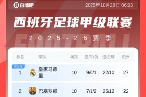 體育資訊10月28日訊 凌晨馬競(jìng)客場(chǎng)2-0戰(zhàn)勝貝蒂斯,至此西甲第10輪比賽全部結(jié)束。