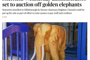 體育資訊10月28日訊 據(jù)《泰晤士報》報道,進(jìn)入托管狀態(tài)的謝周三俱樂部正采取多種措施籌集資金,托管人準(zhǔn)備拍賣掉前主席錢西里安放在希爾斯堡球場的兩尊標(biāo)志性金象雕像。這些雕像因擔(dān)心被球迷破壞或盜竊已被移至室內(nèi)。