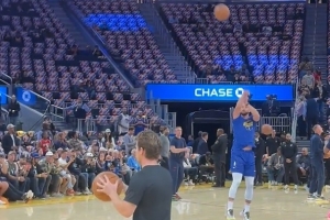 賽前熱身環(huán)節(jié),勇士球星庫里在中圈出手,皮球精準(zhǔn)入筐。