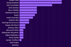 體育資訊10月31日訊 數(shù)據(jù)機(jī)構(gòu)squakwa統(tǒng)計(jì)了本賽季曼城隊(duì)內(nèi)的英超成功爭(zhēng)頂情況,哈蘭德和魯本-迪亞斯并列最多。