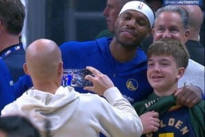 賽前發(fā)生有趣一幕,巴特勒不敢相信場邊一個小孩兒竟然穿著希爾德的7號球衣,希爾德則抱著小孩兒搶著與后者合影。