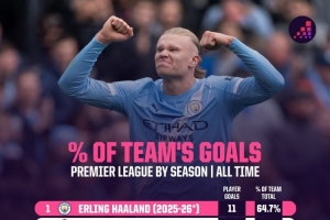 依賴!哈蘭德本賽季聯(lián)賽進(jìn)球占比全隊64.7%,英超歷史最高